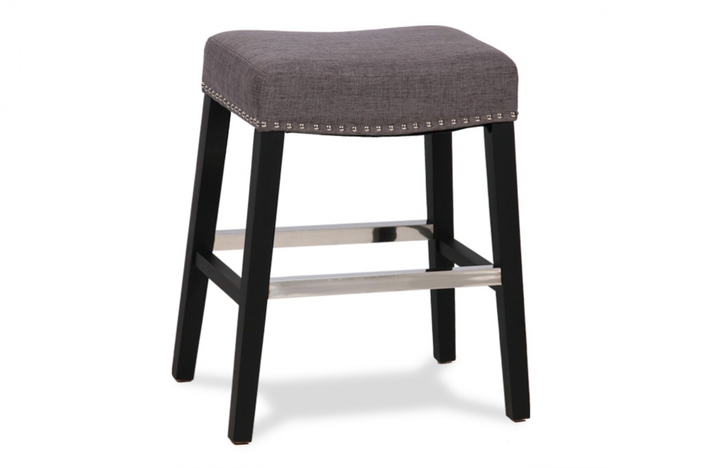 Grey fabric counter stools awith grey fabric and silver nailheads. Dark wooden legs and stainless steel footrest.