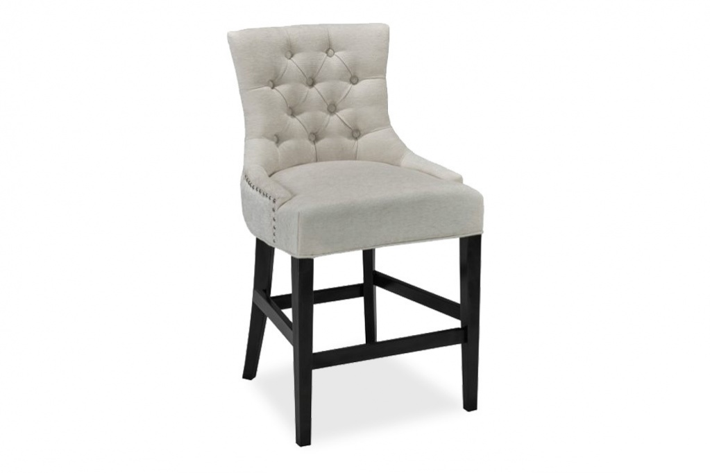 Light beige Fabric counter chair on dark espresso wooden legs. Silver nail studs.