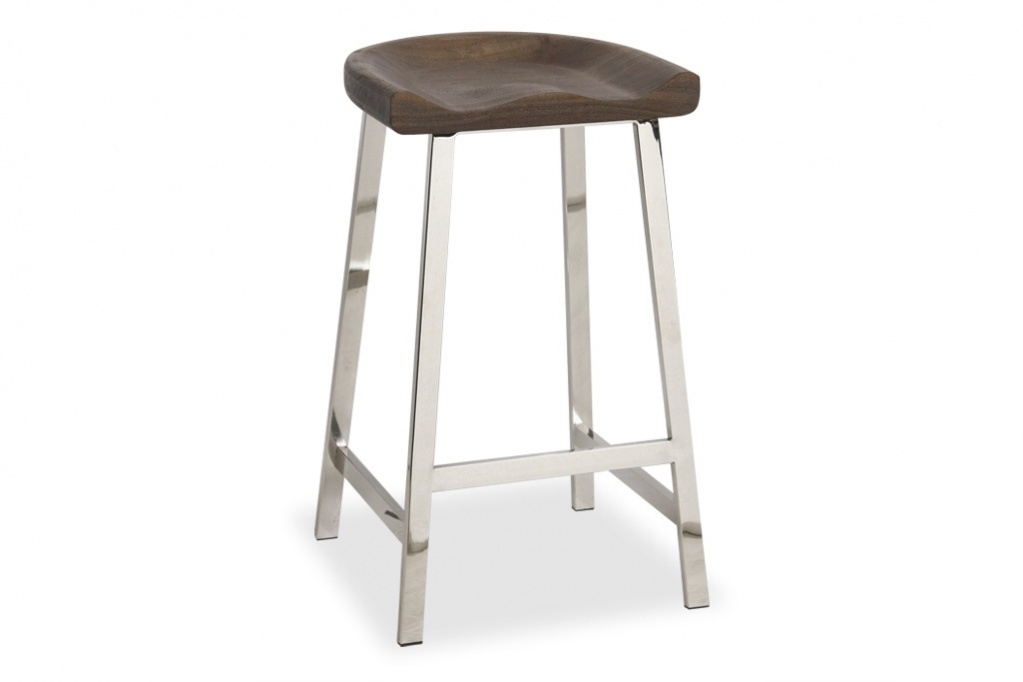 Saddle wood top counter stool with polished stainless steel frame.