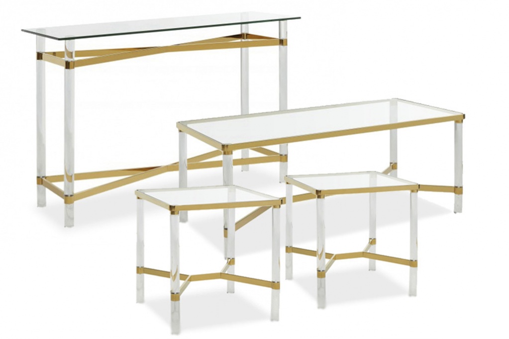 Clear, tempered glass top coffee table set with round, clear acrylic legs. The top frame and stretchers are metal in a gold finish.