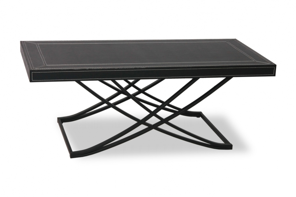 Black leather coffee table with white stitching on top and edges. Black metal legs.