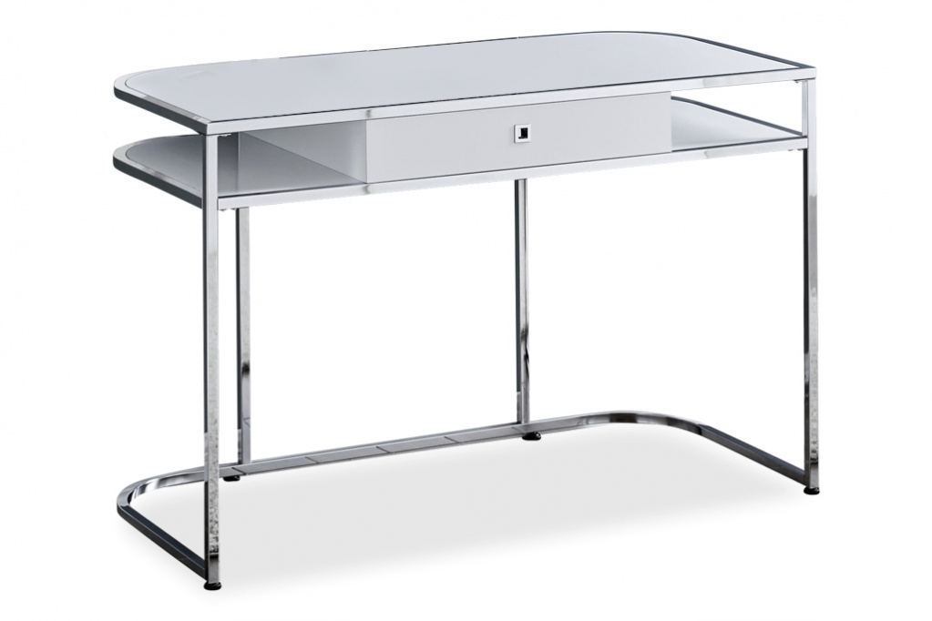 Glam up your home office with this sleek computer desk in glossy white and chrome-metal finishes. The metal frame extends up and wraps around the two tiers of the desk for a polished look. A spacious desktop provides ample space for a laptop andaccessories. Finished on all sides, this space-saving desk can be placed anywhere in a room and can even be used as an accent table.