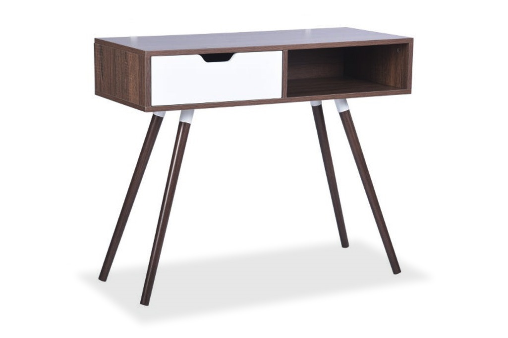 In a walnut finish that emphasizes the contrasting white drawer, this table's A-line design with tapered legs provides sturdy support. With a functional drawer on metal glides, this mini desk will act as a central hub for the living room or entryway, or a perfect desk, while creating a focal point of allure and charm.