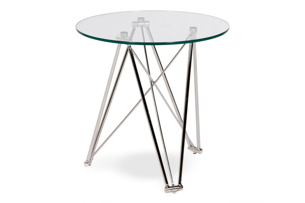 Modern round clear glass top end table set on metal legs in chrome finish.