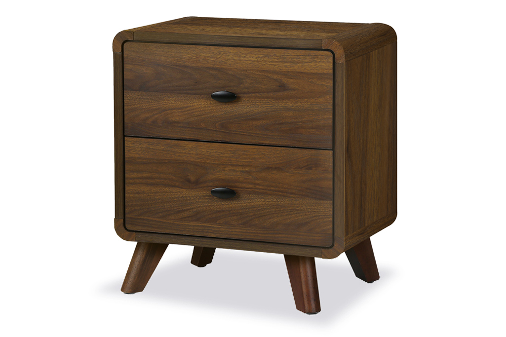 - Freshen up your bedroom decor with this trendy and chic two drawer nightstand, in a mid-century design, beautifully finished in a rich walnut that complements any style.