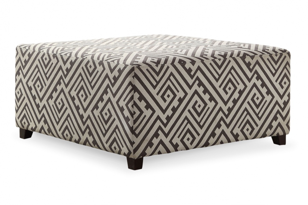 Geometric patterned, textured grey and white fabric ottoman on solid dark wooden feet.