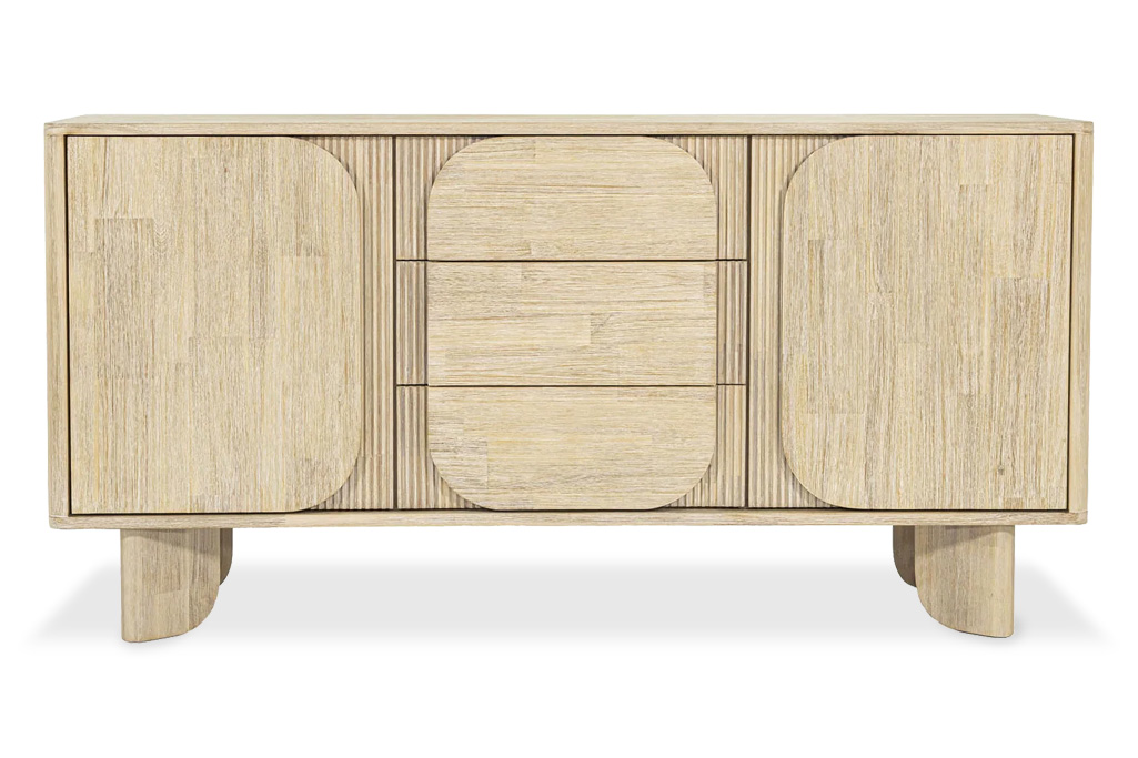 - The sideboard includes three center drawers with standard runners, providing easy access and enhanced functionality.