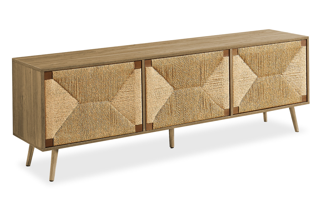 Transform your living space into a chic media entertainment center with this stylish and modern tv stand! This 72-inch long beauty in a light walnut laminate, with cabinet doors crafted in natural seagrass, is the epitome of fashionable style. Durably designed for long-lasting use, this tv stand offers solid wood legs, three spacious closed storage cabinets with an adjustable shelf in the middle cabinet and two wire management holes in the back to keep your space tidy and organized. The push latch mechanism to easily open and close the cabinets showcase a contemporary design, while the easy-to-clean top makes maintenance a breeze. Easy to assemble with step by step illustrated instructions and all hardware included this visually appealing tv stand will be a stand-out in your living room, bedroom, or family room. With a 5 year limited warranty against any defects, you can enjoy peace of mind you have invested in a quality made tv console. Upgrade to a modern mid-century look with this tv stand that combines solid construction with a touch of natural seagrass.